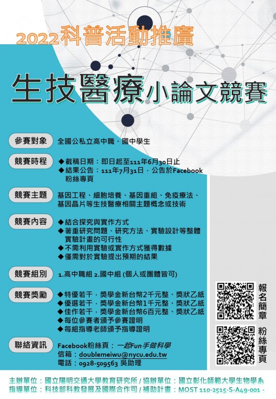 一、「2022科普活動推廣-生技醫療小論文競賽」分為高中職組及國中組,小論文研究主題為基因工程、細胞培養、基因重組、免疫療法、基因晶片等生技醫療相關主題概念或技術,特邀請貴校師生踴躍組隊參加。