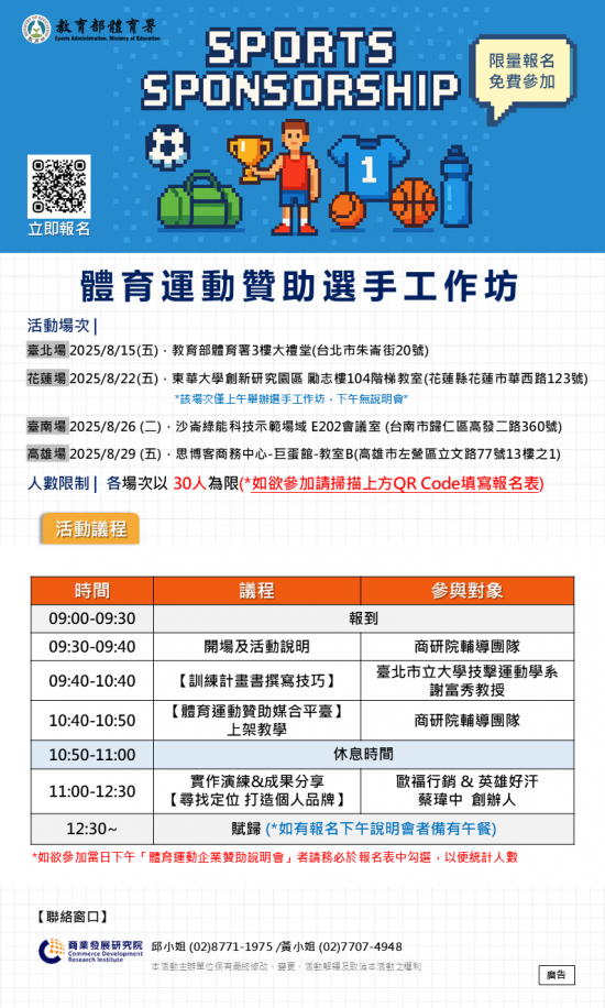 | 四、 | 如欲參與前開活動,請填報活動報名表,各場次活動限 30 人參加,額滿截止,報名連結: https://www.surveycake.com/s/2Mqao ;本案如有任何疑問,請逕洽體育署邱小姐:( 02 ) 8771-1975 、體育署柳先生:( 02 ) 8771-1826 。 |