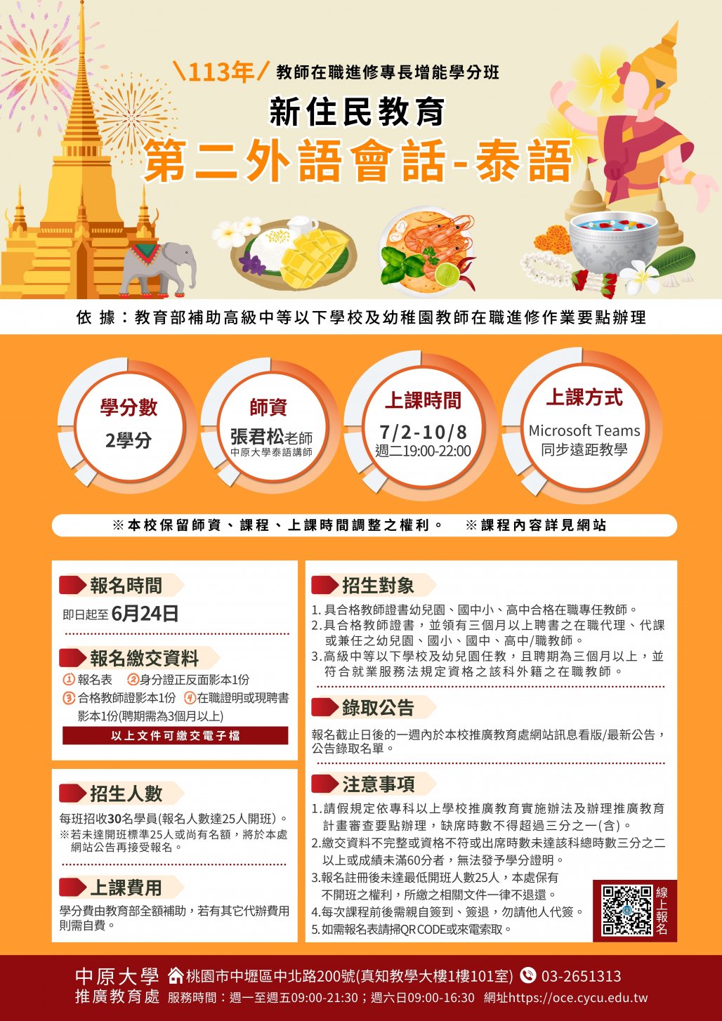 「新住民教育-第二外語會話(泰語)-同步遠距教學」課程之報名截止日為113年6月24日,限額30名。