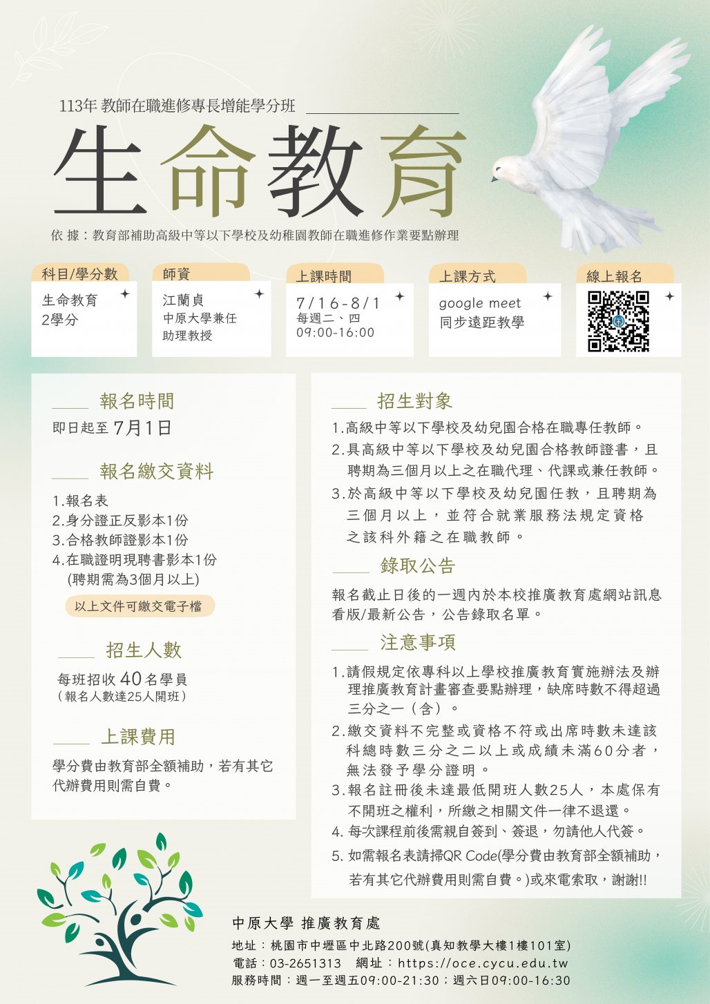 「生命教育-同步遠距教學」課程之報名截止日為113年7月1日,限額40名。
