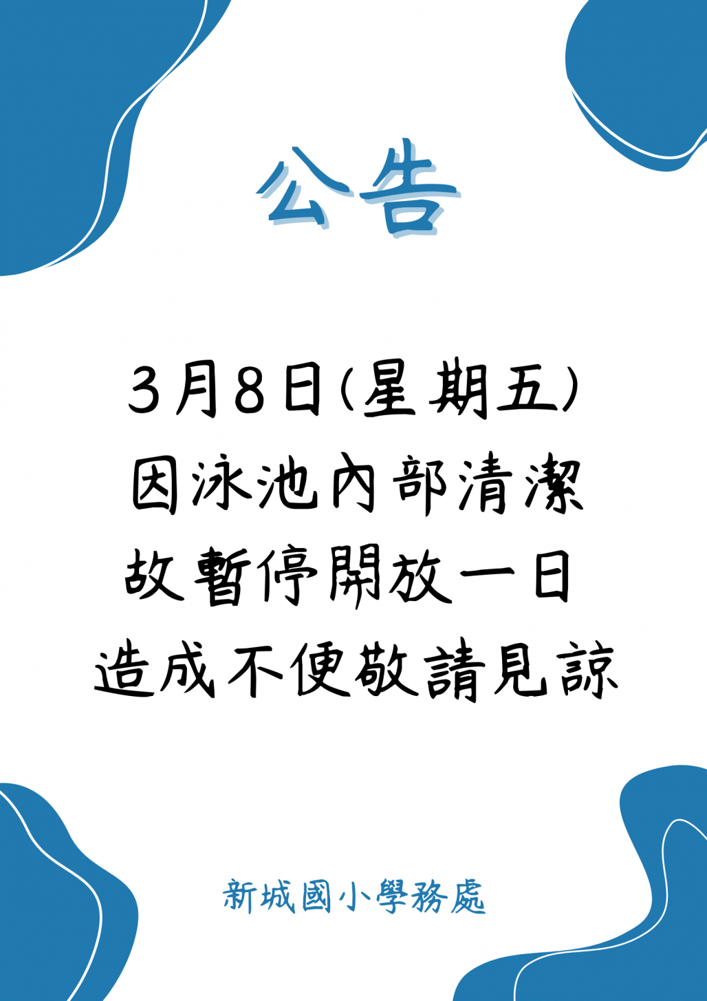 113年3月8日(星期五)泳池暫停開放。