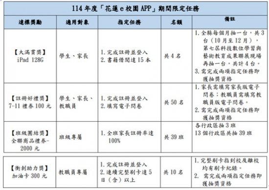 為鼓勵親師生,花蓮教育處舉辦114年度「花蓮e校園APP」相關活動,活動期間內完成指定任務者,得獲達標獎勵抽獎資格,獎品包含iPad、7-11禮券、全聯禮券等多項好禮。 相關資訊請參考附件圖片檔。