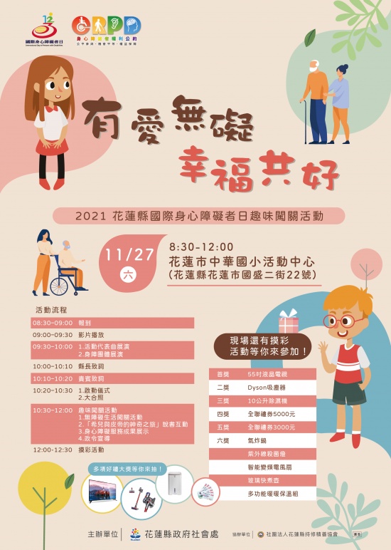 花蓮縣政府定於110年11月27日(星期六)上午9時至12時,於中華國小活動中心,辦理「2021花蓮縣國際身心障礙者日『有愛無礙 多元共好』~趣味闖關」活動宣導,敬邀共襄盛舉踴躍參加