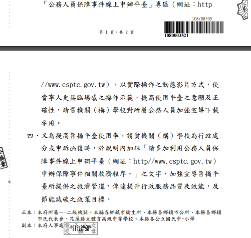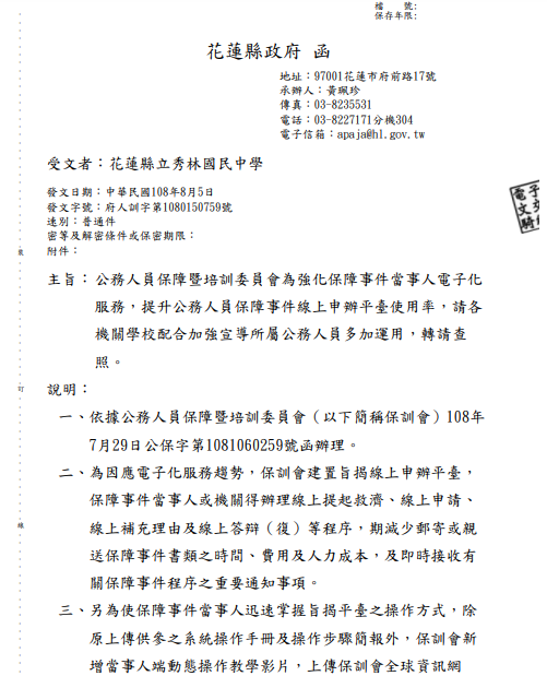 公務人員保障暨培訓委員會為強化保障事件當事人電子化服務,提升公務人員保障事件線上申辦平臺使用率,請各機關學校配合加強宣導所屬公務人員多加運用,轉請查照。