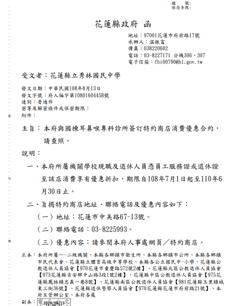 花蓮縣政府與國棟耳鼻喉專科診所簽訂特約商店消費優惠合約,請查照。