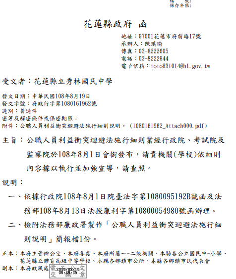 公職人員利益衝突迴避法施行細則業經行政院、考試院及監察院於108年8月1日會銜發布,請貴機關(學校)依細則內容據以執行並加強宣導,請查照。