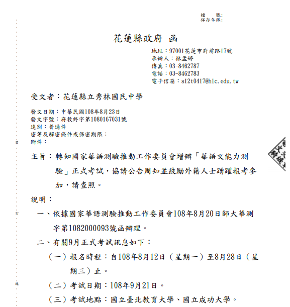 轉知國家華語測驗推動工作委員會增辦「華語文能力測驗」正式考試,協請公告周知並鼓勵外籍人士踴躍報考參加,請查照。