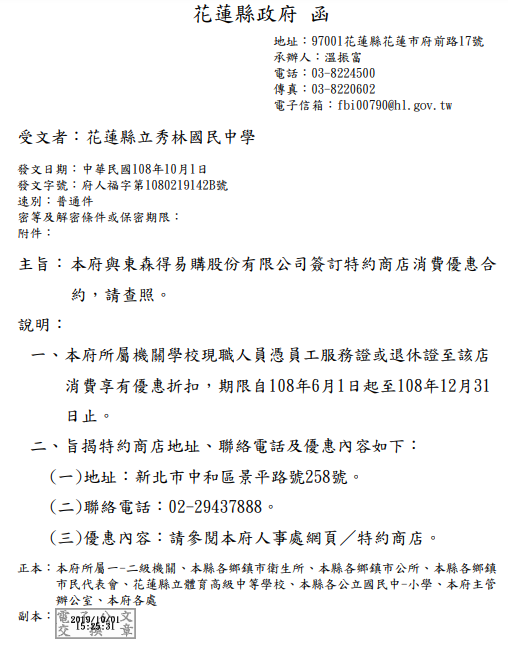 轉知花蓮縣政府與東森得易購股份有限公司簽訂特約商店消費優惠合約,請查照。