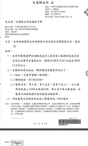 花蓮縣政府與健康陽光休閒館簽訂特約商店消費優惠合約,請查照。