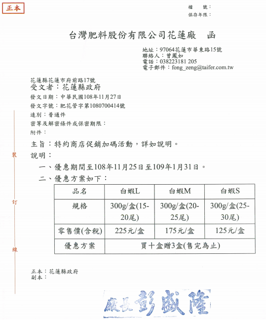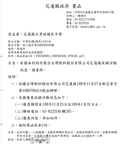 有關花蓮縣政府特約商店台灣肥料股份有限公司花蓮廠促銷活動訊息,請查照。