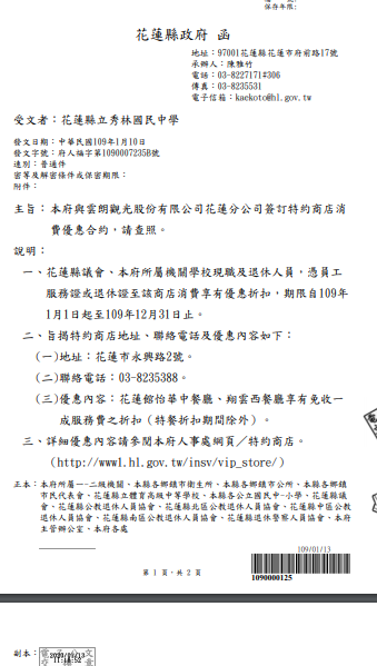 花蓮縣政府與雲朗觀光股份有限公司花蓮分公司簽訂特約商店消費優惠合約,請查照。