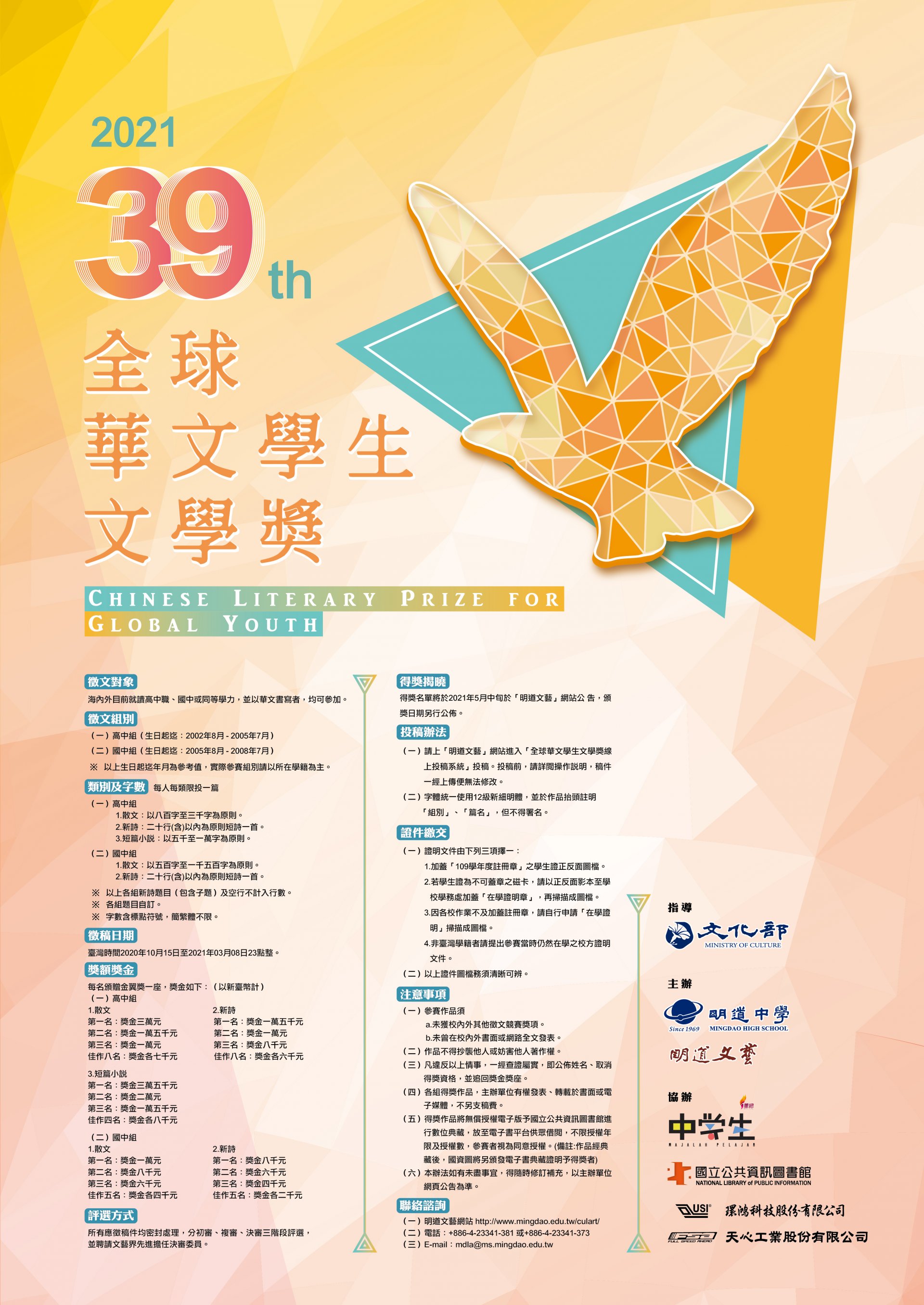 臺中市私立明道高級中學舉辦「第39屆全球華文學生文學獎」競賽,請本校學生踴躍投稿參與。