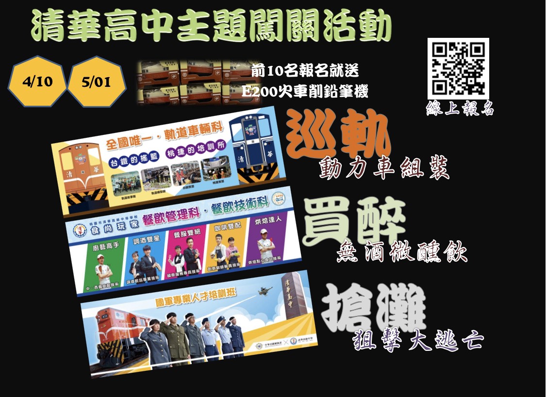 四、報名方式:掃描附件之QRCODE報名或至清華高中輔導室紙本報名,桃園市學生參加者可提供接車服務(08:00在校門口候車)、外縣市同學統一於富岡火車站乘車。