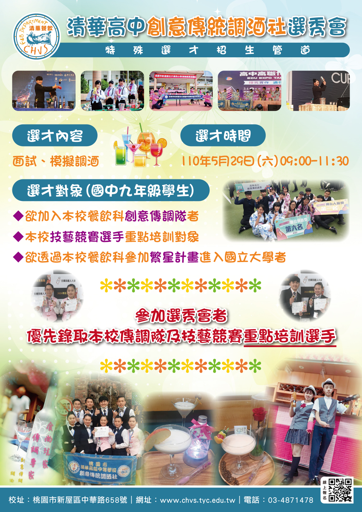 二、對象:有意加入本校創意傳統調酒隊者、有意加入技藝競賽重點培訓選手者、有意透過繁星計畫進入國立科大者及有意加入餐飲科之同學。