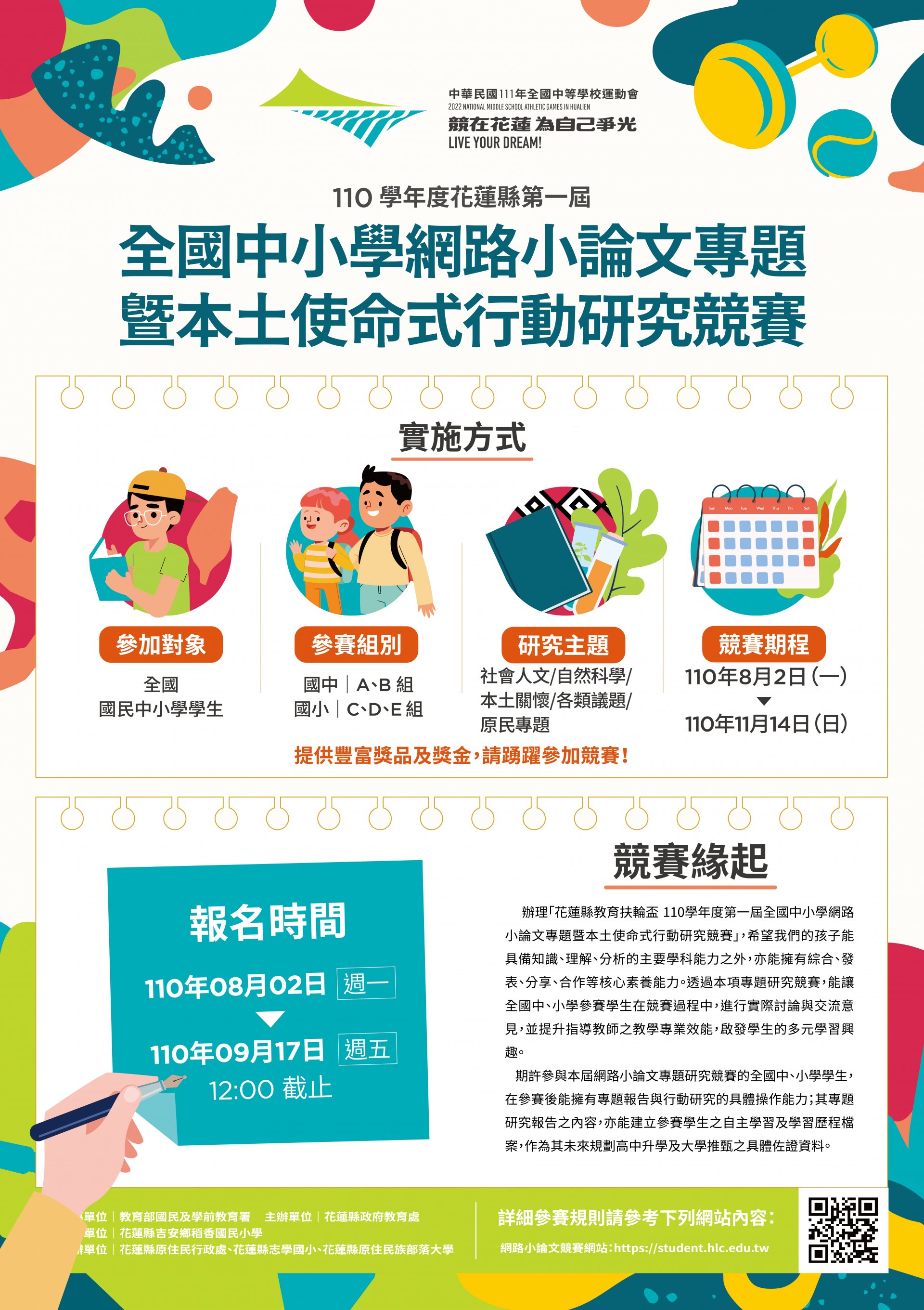 110學年度花蓮縣第一屆全國中小學網路小論文暨本土使命式行動研究競賽,請本校師生踴躣參加。
