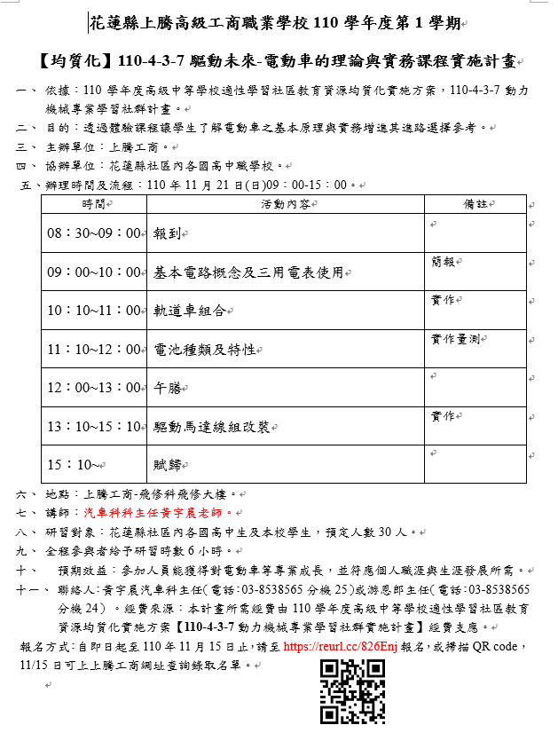 一、依據:110學年度高級中等學校適性學習社區教育資源均質化實施方案,110-4-3-7動力機械專業學習社群計畫