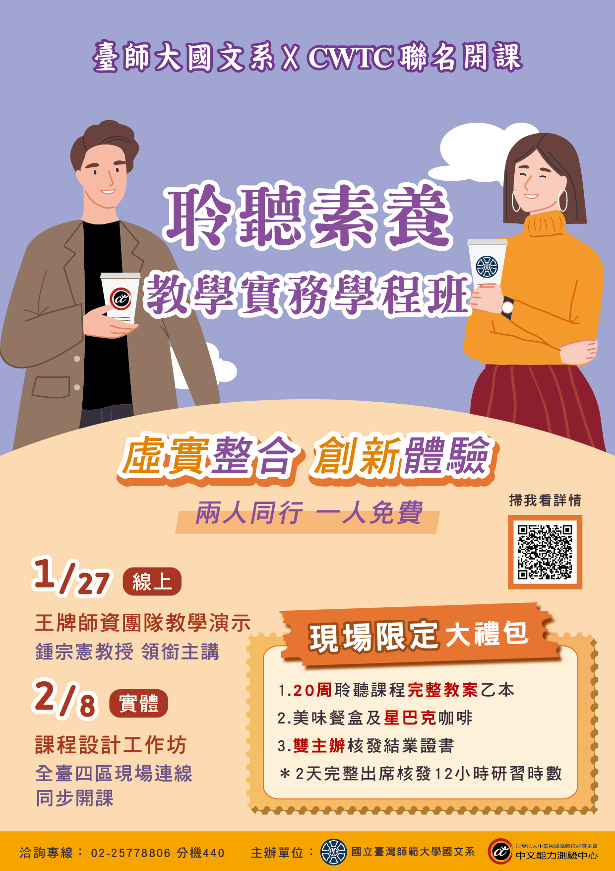 - 為使更多教師了解聆聽素養教學教法,並實際應用於教學現場,本會特辦理本項學程班,由臺師大國文系鍾宗憲教授帶領7位專家團隊擔任講師,介紹聆聽素養課程教案、說明如何實際操作課堂活動,以利於在課堂上培養聆聽能力。