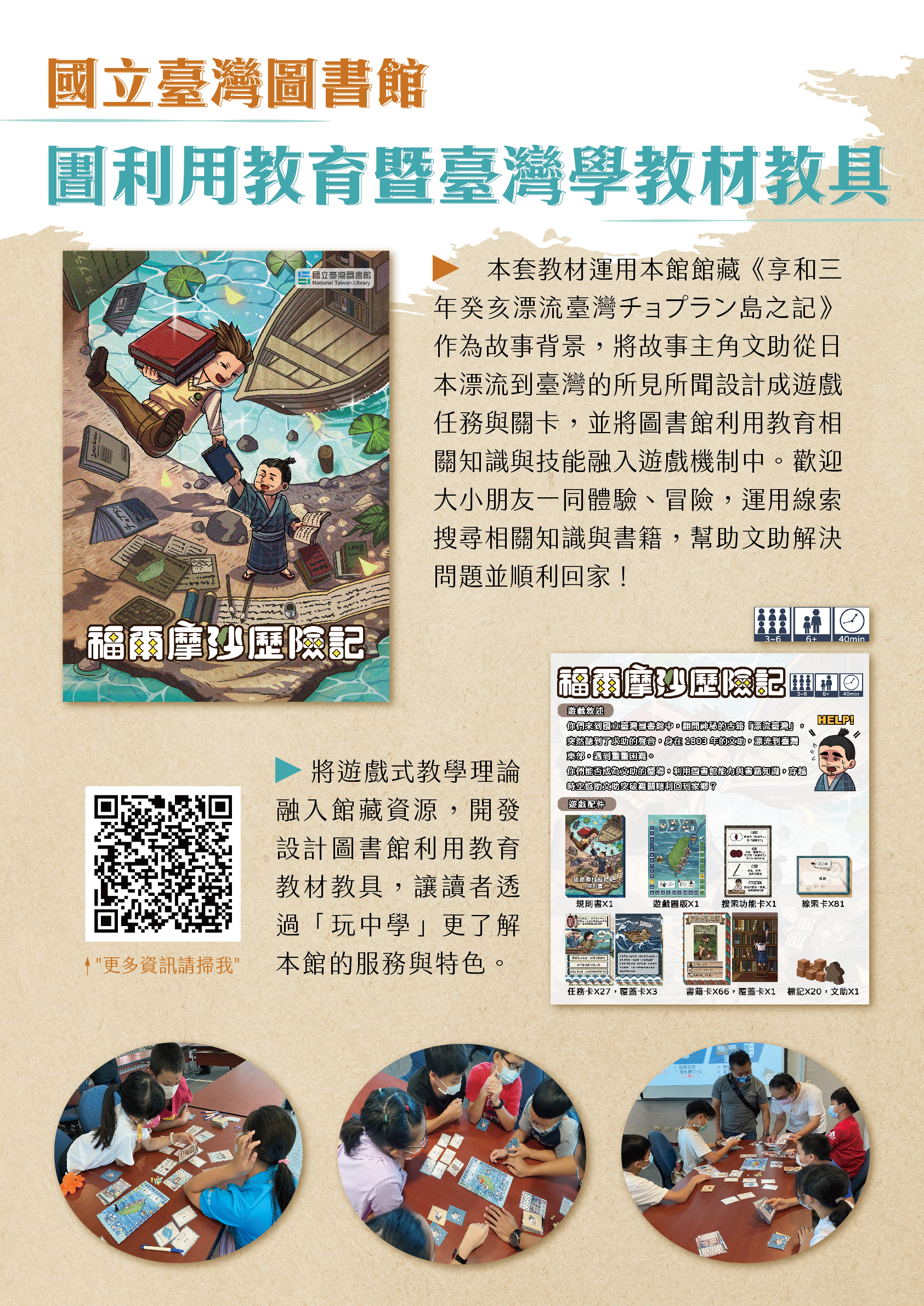 | 三、 | 「福爾摩沙歷險記(桌遊)」係運用國立臺灣圖書館館藏《享和三年癸亥漂流臺灣チョプラン島之記》作為故事背景,將故事主角文助從日本漂流到臺灣的所見所聞設計成遊戲任務與關卡,並將圖書館利用教育相關知識與技能融入遊戲機制中。玩家須運用線索搜尋相關書籍與知識,幫助文助解決問題並順利回家! |