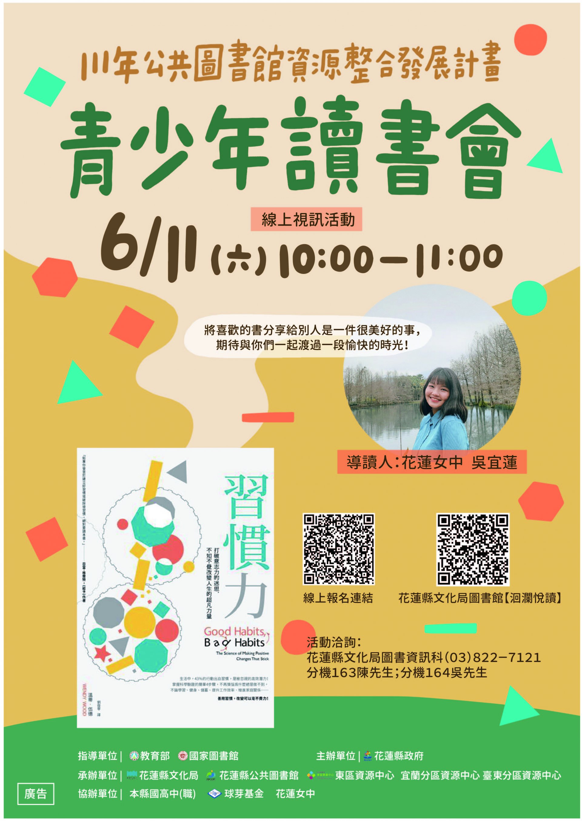 | 主旨: | 有關本局辦理「111年公共圖書館資源整合發展計畫-越讀者聯盟-青少年讀書會」線上視訊活動,請惠予協助宣傳並轉知所屬踴躍參加,請查照。 |