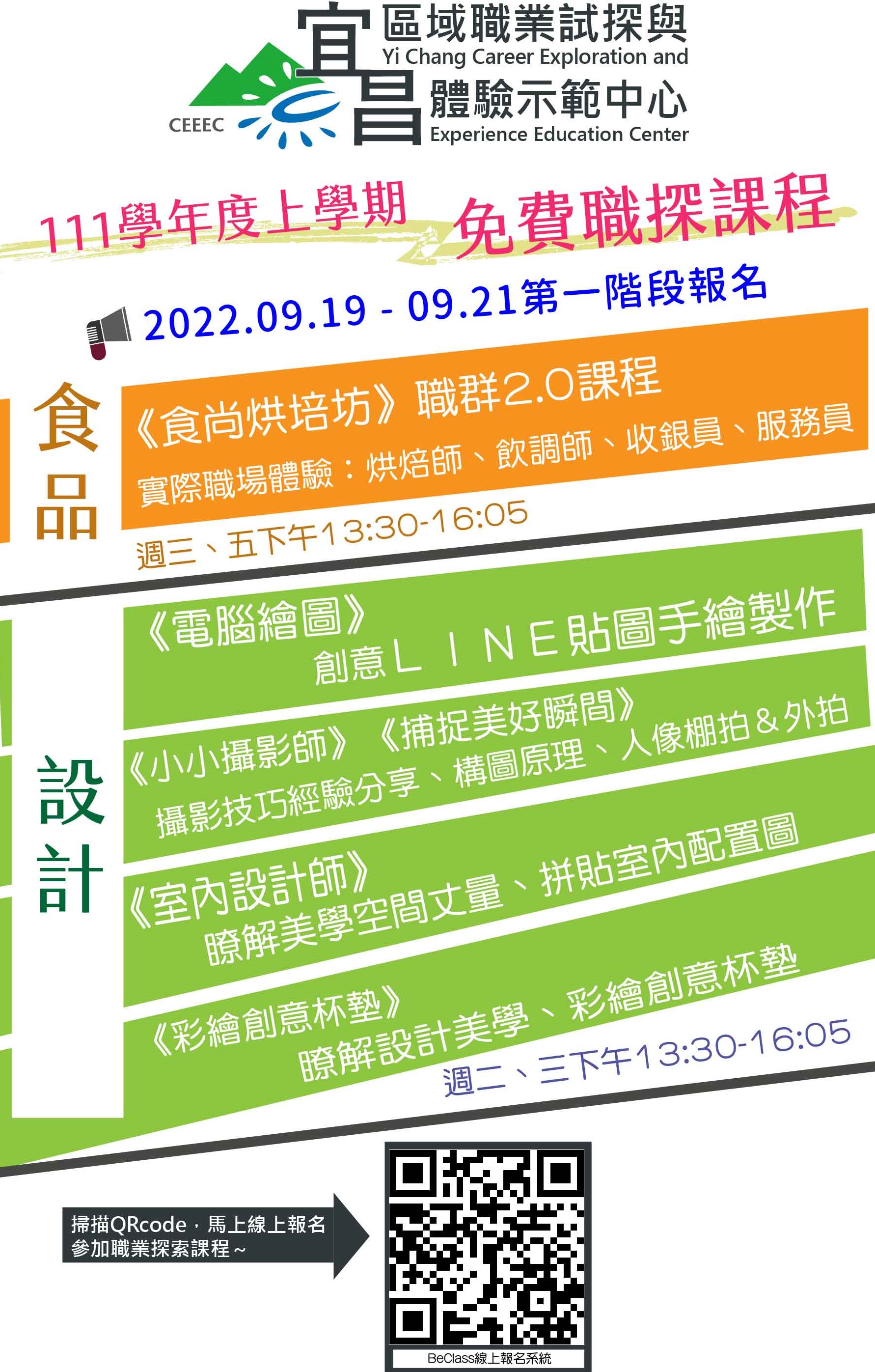 二、第一階段報名時間自111年9月19日9時起至111年9月21日17時止,請逕自前往宜昌國中校網公告中點選報名連結,或至 BeClasseClass線上報名系統搜尋「宜昌國中」(https://bit.ly/3KUgxBv )進行報名作業,錄取名單將於111年9月23日公布 於宜昌國中校網公告中。