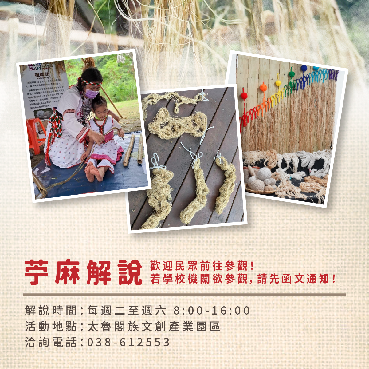 - 「苧麻園解說」:時間:每周二至周六,上午8時至下午4時。內容:歡迎民眾前往參觀,若學校機關欲參觀,請先函文通知。洽詢電話:038-612553。