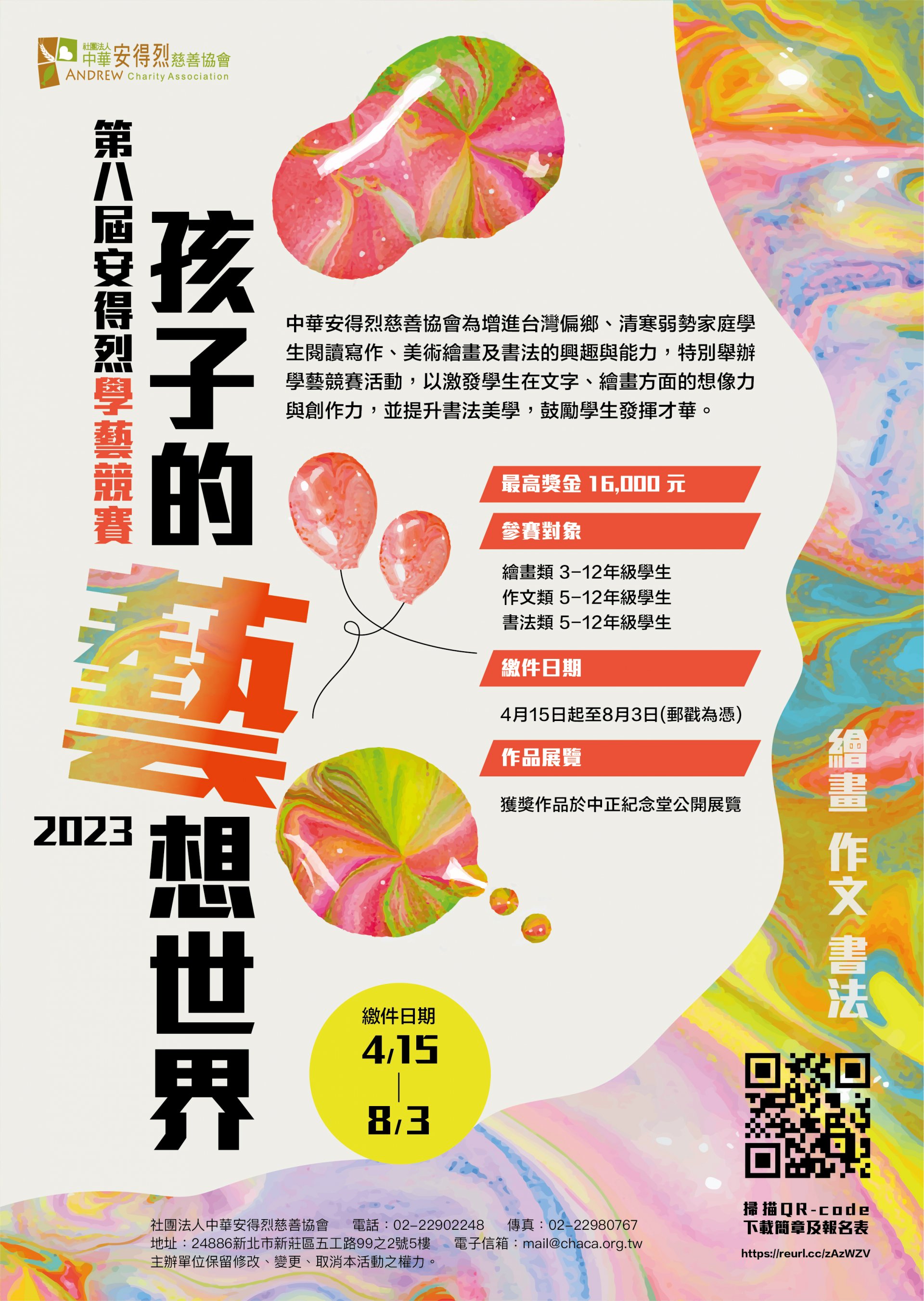 - 徵稿日期:自112年4月15日起至8月3日止,以郵寄方式繳交作品。收件人:邱議鋒先生,收件地址:新北市新莊區五工路99之2號5樓。