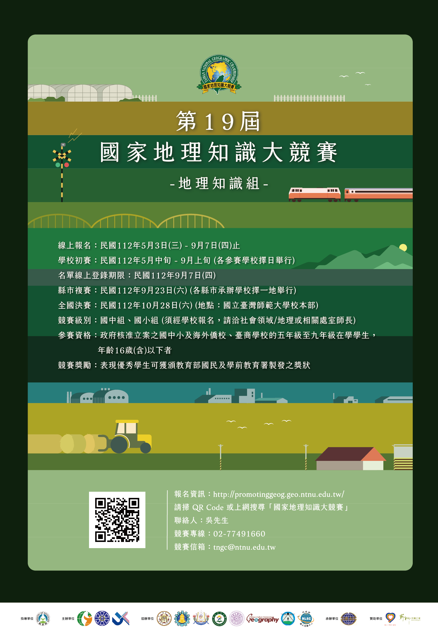 - 旨揭競賽係由教育部國民及學前教育署補助該學會辦理,並由國立臺灣師範大學地理學系承辦,競賽項目分為「地理知識組」與「環境觀察暨手繪地圖組」(簡稱手繪地圖組)兩項,並均自112年5月3日(星期三)至9月7日(星期四)可報名,相關活動訊息與報名資訊詳參附件及該競賽網頁(http://PromotingGeog.geo.ntnu.edu.tw)。