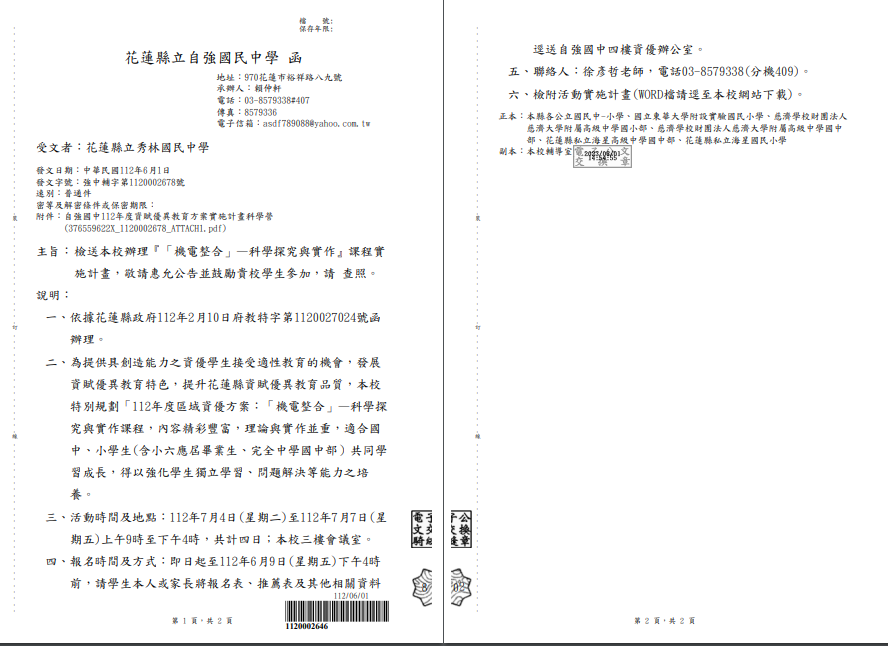 五、報名時間及方式:即日起至112年6月9日(星期五)下午4時前,請學生本人或家長將報名表、推薦表及其他相關資料逕送自強國中四樓資優辦公室。
