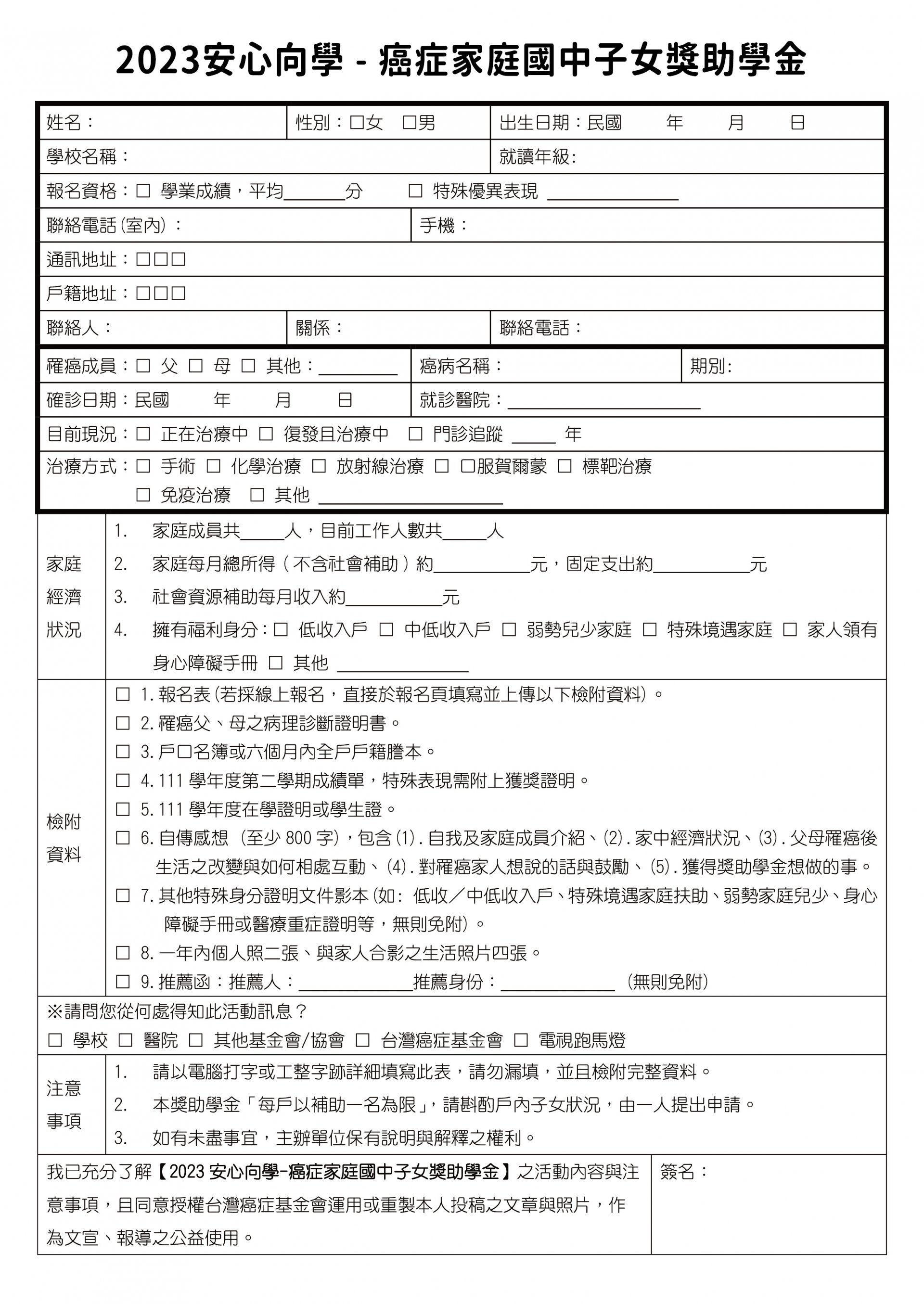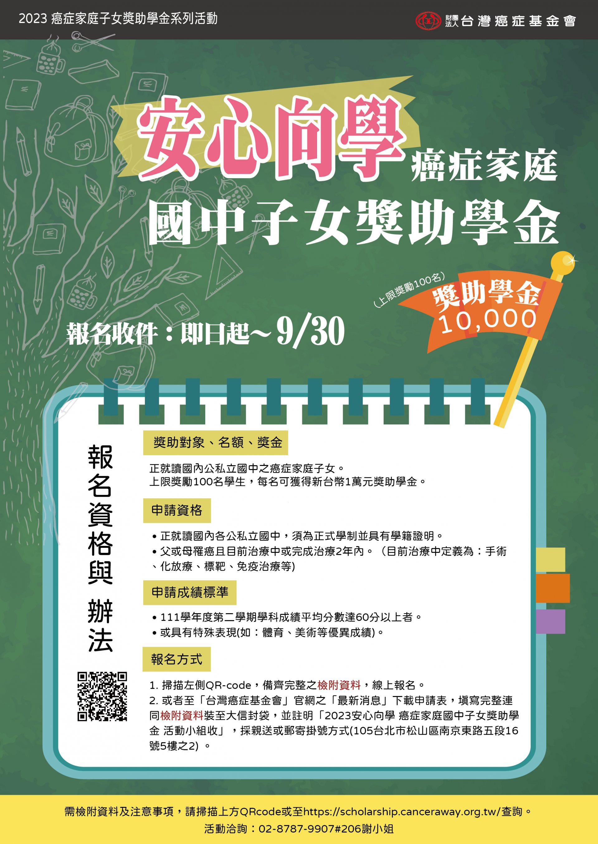 | 主旨: | 轉知財團法人臺灣癌症基金會辦理「2023安心向學-癌症家庭國中子女獎助學金」活動,收件日期自即日起至112年9月30日止,請貴校協助符合資格學生提出申請, 請查照。 |