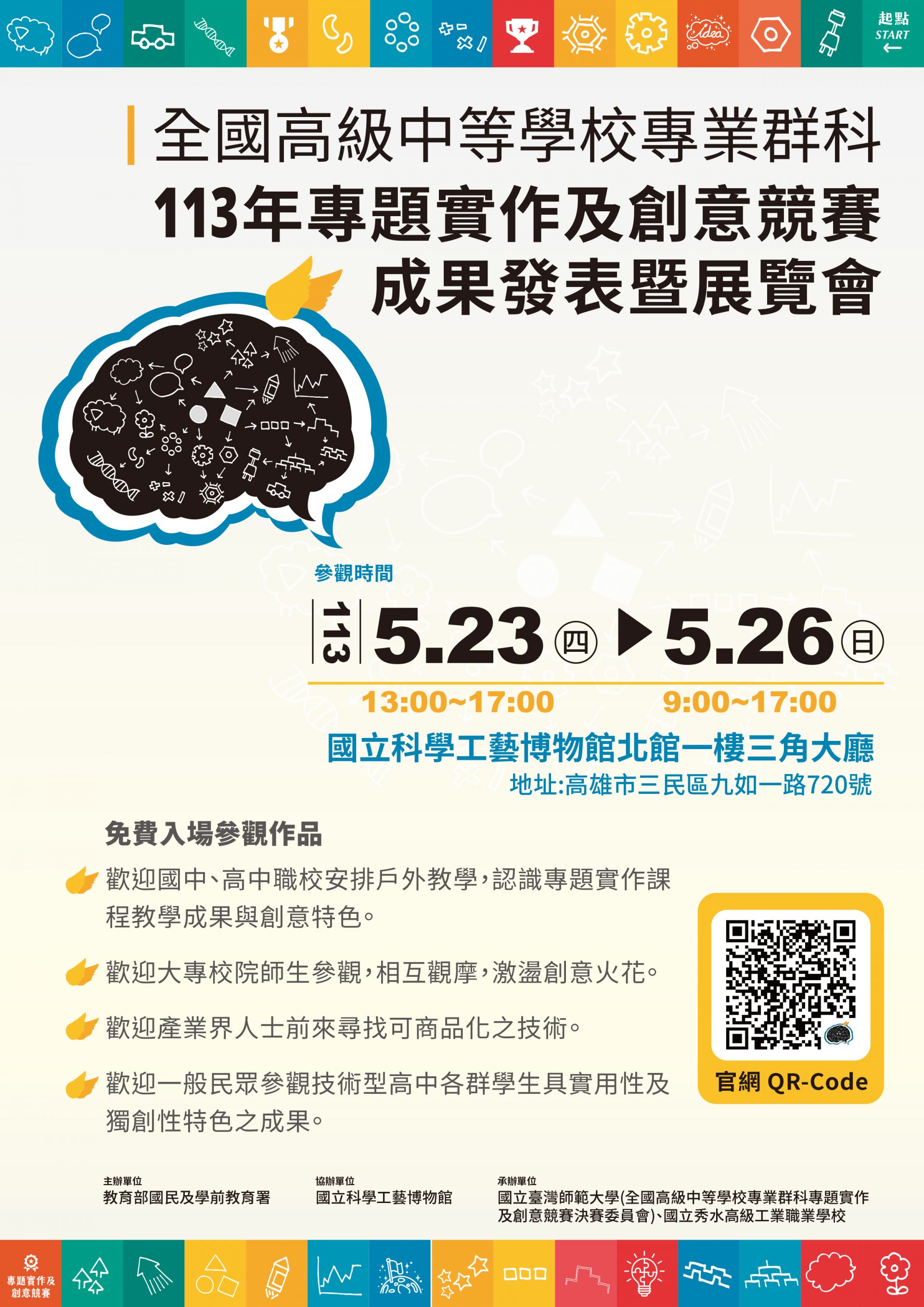 二、活動內容:展出全國技術型高中113年專題實作及創意競賽「專題組」及「創意組」15群第1名作品,展現技術型高中學習成果。