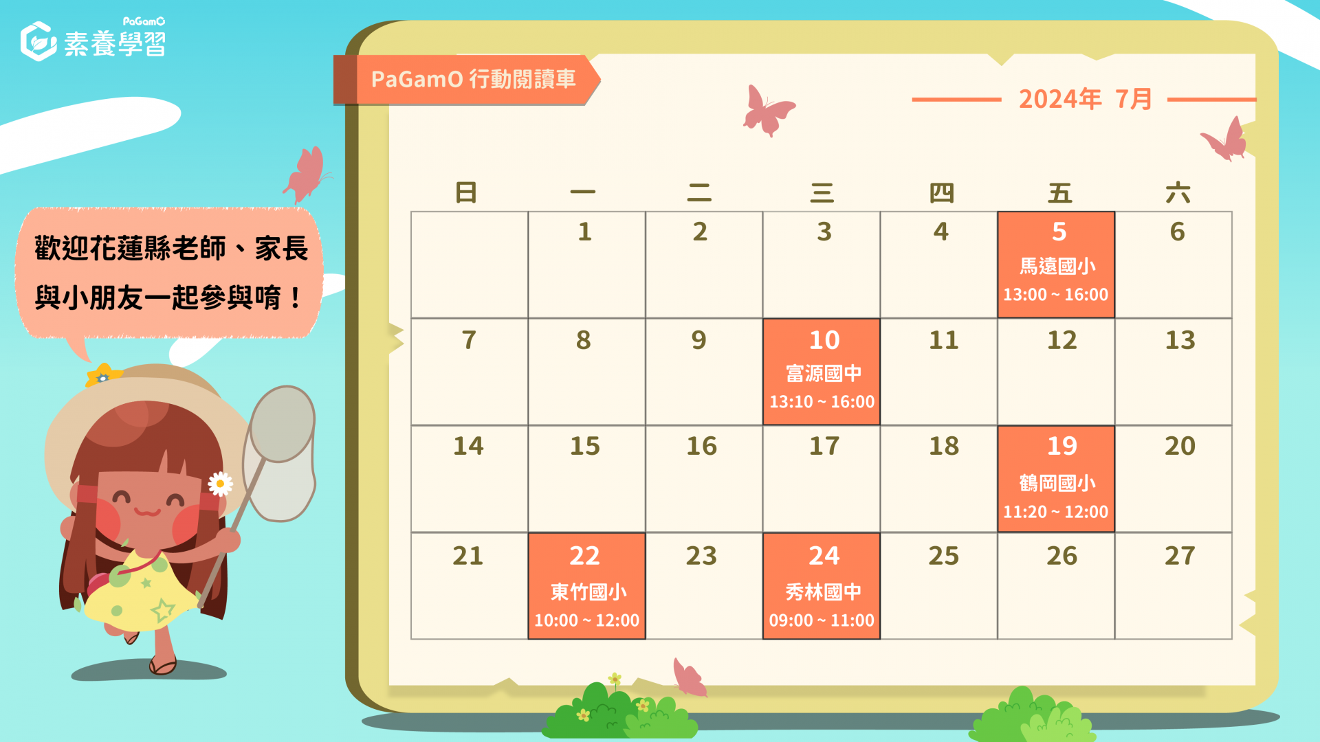 | 一、 | 為解決暑期學生數位學習滑波,花蓮PaGamO素養品學堂將於2024年7、8月暑假期間舉辦【行動閱讀車】活動,藉由數位閱讀與親師生互動,促進學生數位素養及閱讀習慣,活動將以實體及線上直播方式同步進行。 |
