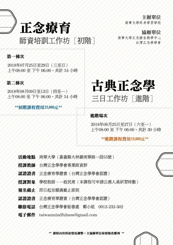 檢送南華大學辦理107年「正念療育師資培訓工作坊」課程簡章、課程海報各1份,請協助轉知所屬員工並公告民眾周知,請查照。