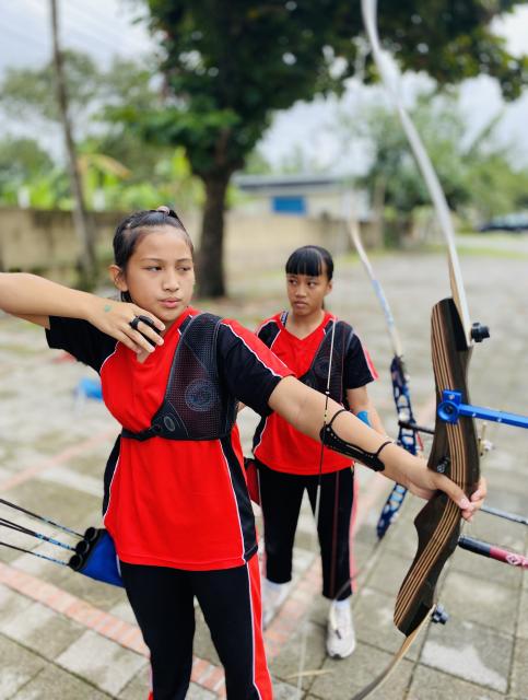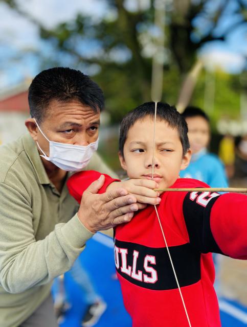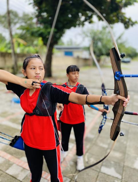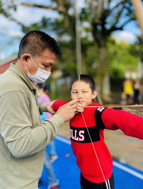 一邊是傳統射箭、一邊是反曲弓,兩邊的孩子都很認真在拉弓、瞄準,在劉光照教練嚴格的要求下,每個孩子的鼻子都變扁了~