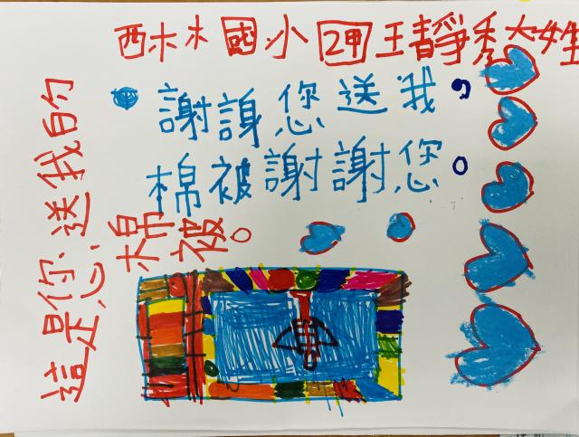 這是有一位住在新城的張瓅心阿姨,她曾經發願~當她賺了錢,她一定要幫助別人。 每年冬天來臨前,她會買很多很多的棉被,並且將這些棉被送給需要的人們,期盼大家都能度過暖暖的冬天。孩子們需要棉被,張瓅心阿姨隨即送來了! 蓋上柔柔暖暖的棉被,心裡是否充滿著感謝呢? 親手寫一張卡片表示感謝是最基本的禮貌,請記得這份溫暖。 有一天,當你有能力時,也要將這份暖暖的情意傳遞下去喔!