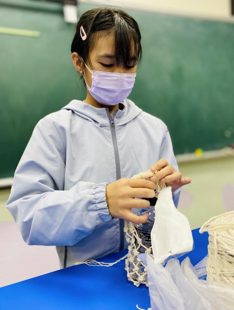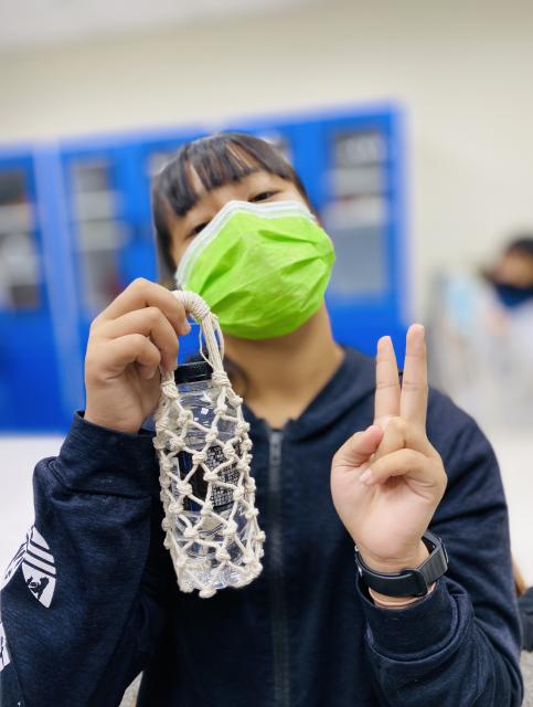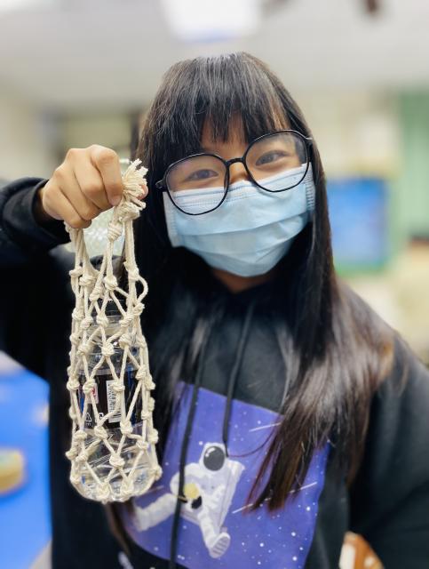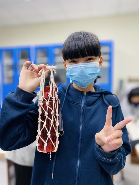 杯袋編織~只要兩隻手就可以囉!很簡單,倆倆交錯打個結......,結果,線太短了~至少要150~300公分的長度才夠啦!