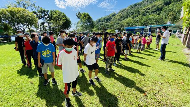 雖然還沒驗收,但孩子們在老師的注視之下-試用跑道與球場,感受一下藍色的魅力。