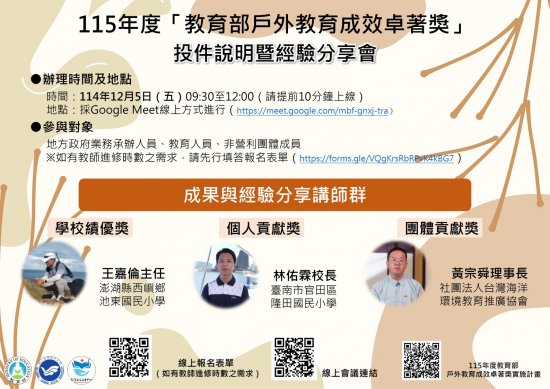 二、為提升地方政府、學校、教育人員與團體,對於115年度 「教育部戶外教育成效卓著獎」之認識,