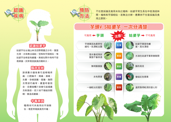 三、 | 該署已製作「姑婆芋宣導單張」、「綠褶菇宣導單張」及「吃河豚風險大-臺灣常見有毒河豚(魨)圖鑑手冊」,可於該部食藥署網站>業務專區>食品>餐飲衛生>防治食品中毒專區>提升防治食品中毒知能專區(http://www.fda.gov.tw/TC/site.aspx?sid=10936&r=1170385348)/「防治食品中毒宣導單張」或/「歷年食品中毒發生與防治年報」之項目下載,請惠予協助周知宣導,不隨意捕捉、採摘及食用來路不明之動植物,以預防天然毒食品中毒發生,確保飲食安全。 |