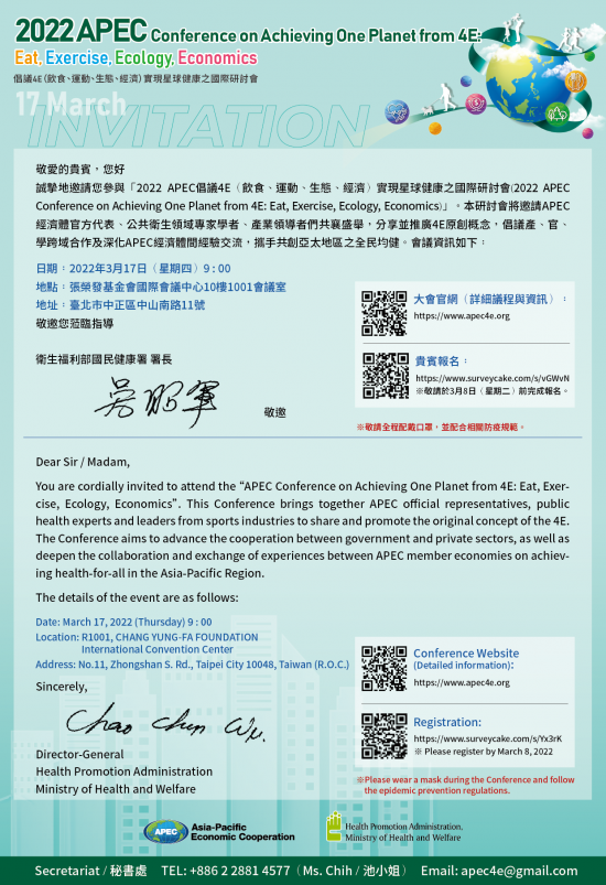 四、 | 本研討會定於111年3月17日(星期四)上午8時30分至下午4時,假張榮發基金會國際會議中心10樓1001會議室舉行,除邀請21個APEC經濟體代表外,亦希冀國內專家學者、機關同仁及對此議題有興趣之夥伴共襄盛舉,大會報名網址為https://www.apec4e.org/registration,會議議程及邀請卡(含大會官網及報名QR Codes)詳如附件,並請於3月8日(星期二)前完成網路報名程序。 |