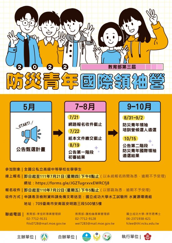 1、 | 以書審方式進行第一階段初選,錄取名額為正取40名,備取5名,得參與國內預先訓練(防災青年國際領袖培訓營);每所學校以錄取2名學生為限。教育部與遴選小組得保留最後裁決權。 |