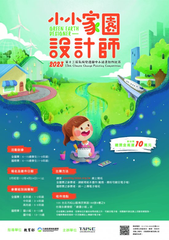 | 一、 | 由教育部、行政院環境保護署指導,本會主辦之「氣候變遷國中小繪畫創作比賽」迄今已舉辦12屆,累計40國、59,152名學子參與。本屆(第13屆)為呼應聯合國永續發展目標(SDGs)的第11項,以「小小家園設計師」為主題,提升國中小師生關注天然災害對城市造成的損傷,思考如何降低城市垃圾和空氣污染,同時重視社區文化與自然遺產等。此繪畫比賽也呼應第13項,採取氣候行動並提升大眾相關意識。 |
