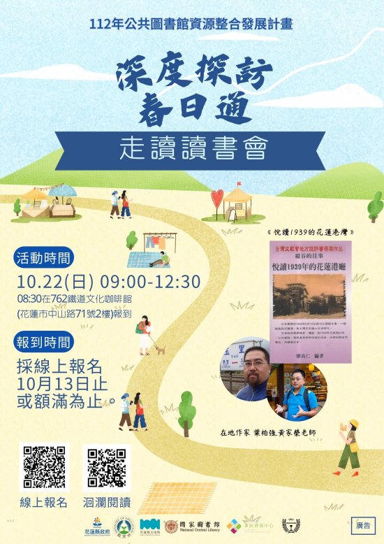 (一)時間:112年10月22日(星期日)上午9時至12:30時。(在762鐵道文化咖啡館(花蓮市中山路71號2樓) 報到)。