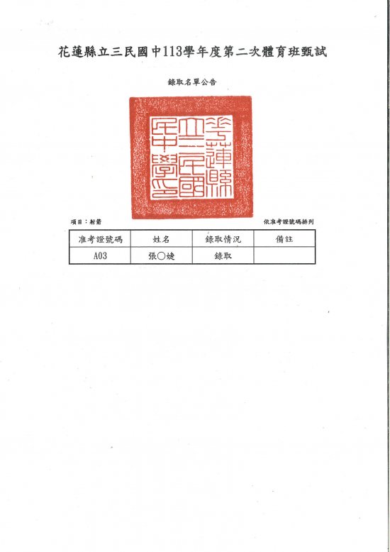 本校113學年度第二次體育班甄試(射箭)錄取公告