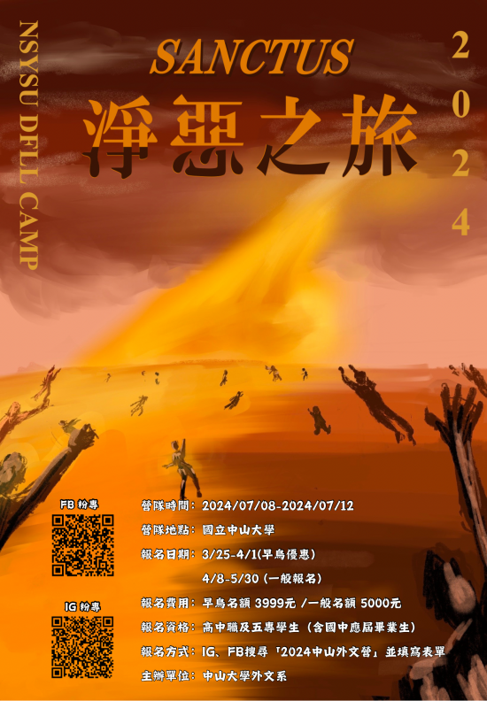 (六) FB粉絲專頁(2024中山外文營):https://www.facebook.com/profile.php?id=61556837051726;IG專頁(Sanctus.2024):https://www.instagram.com/sanctus.2024?igsh=dGdlenRmcnM5OXZ2