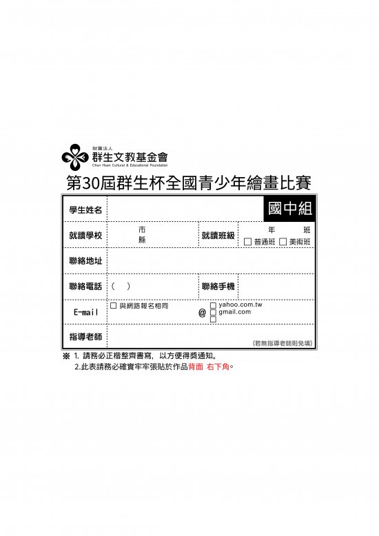 五、 比賽簡章公告於群生基金會網站首頁 https://ischool.fhvs.ntpc.edu.tw/ischool/publish_page/193/,敬請下載查閱。
