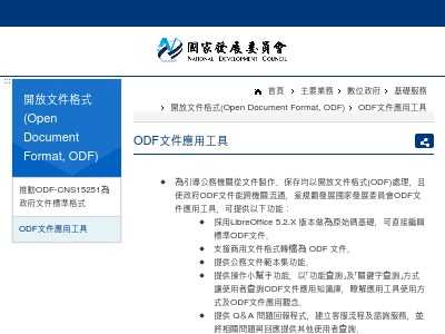 為引導公務機關從文件製作、保存均以開放文件格式(ODF)處理,且使政府ODF文件能跨機關流通,爰規劃發展國家發展委員會ODF文件應用...