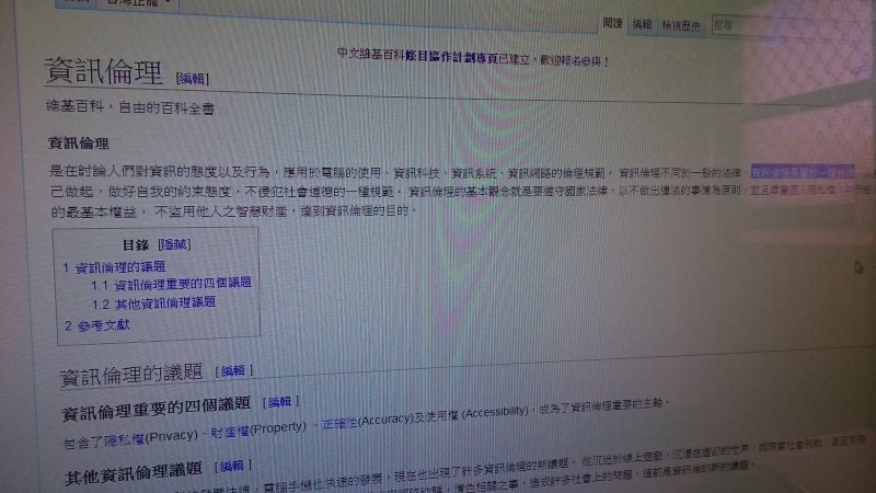 是在討論人們對資訊的態度以及行為,應用於電腦的使用、資訊科技、資訊系統、資訊網路的倫理規範。 資訊倫理不同於一般的法律,資訊倫理是屬於一種自律,以自己做起,做好自我的約束態度,不侵犯社會道德的一種規範。 資訊倫理的基本觀念就是要遵守國家法律,以不做出違法的事情為原則,並且尊重個人隱私權,給予每人的最基本權益, 不盜用他人之智慧財產,達到資訊倫理的目的。