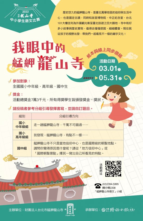 | 四、 | 「2022艋舺龍山寺中小學生徵文比賽 我眼中的艋舺龍山寺」活動網址https://bit.ly/320t70i 或洽活動專線 (02)2394-5995分機2208。 |