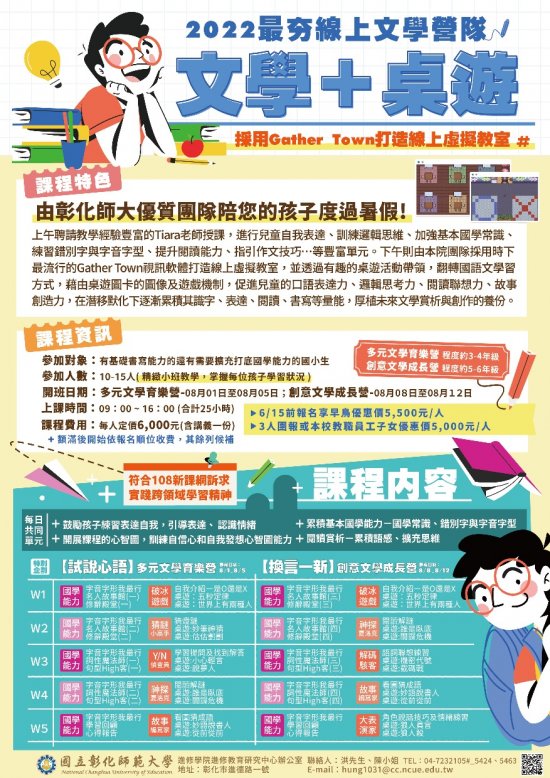 | (一) | 課程特色:國立彰化師範大學進修學院採用時下最流行的Gather Town視訊軟體打造線上虛擬教室,並透過有趣的桌遊活動帶領,翻轉國語文學習方式,藉由桌遊圖卡的圖像及遊戲機制,促進兒童的口語表達力、邏輯思考力、閱讀聯想力、故事創造力,在潛移默化下逐漸累積其識字、表達、閱讀、書寫等量能,厚植未來文學賞析與創作的養份。 |