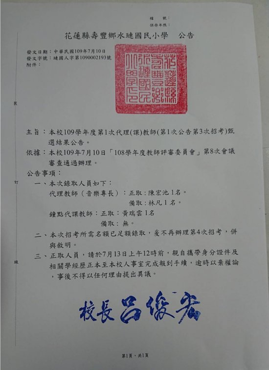 1.錄取代理教師(音樂專長):正取:陳宏池1名